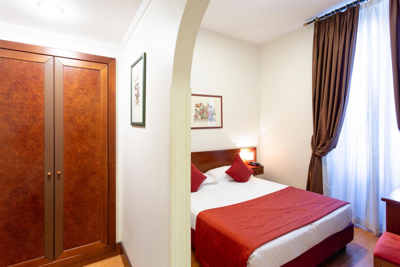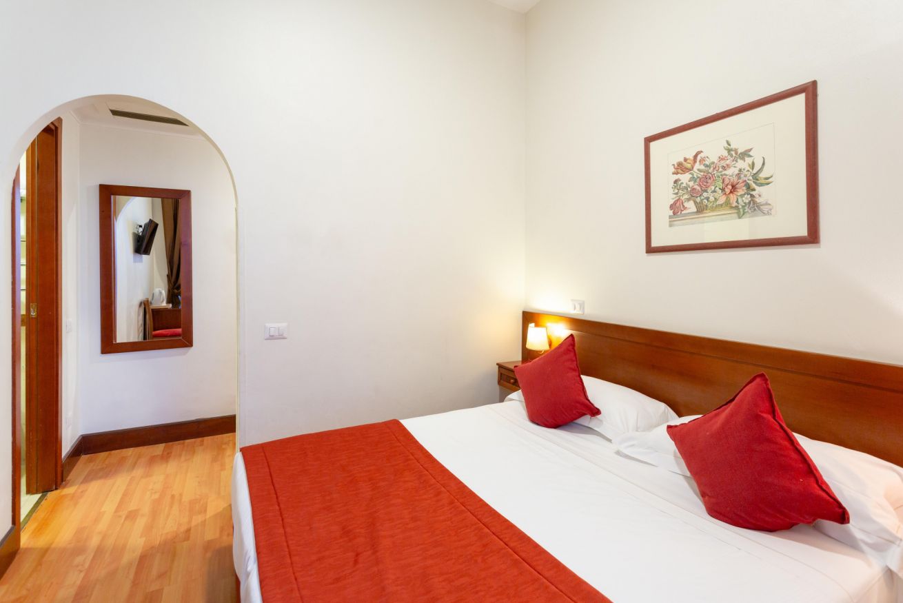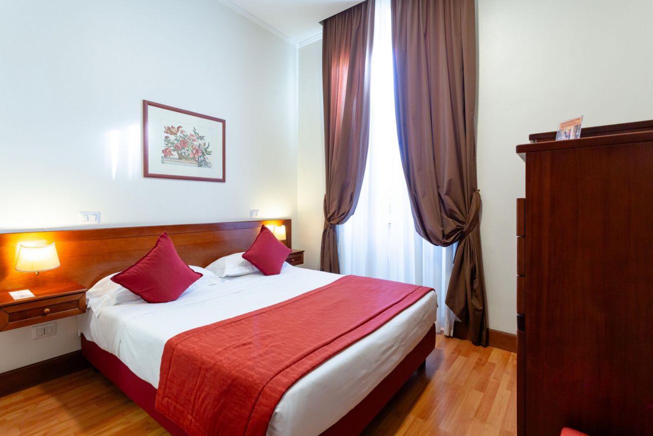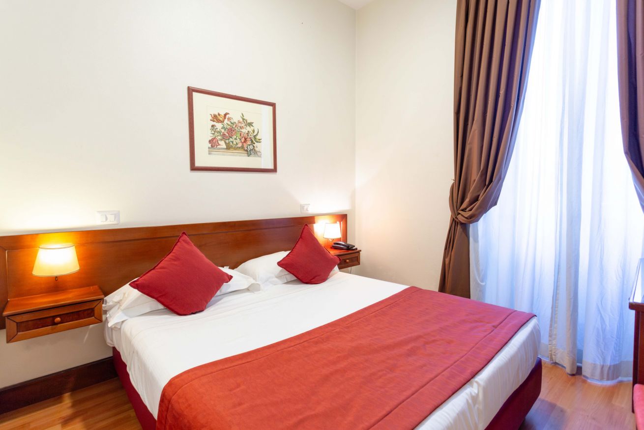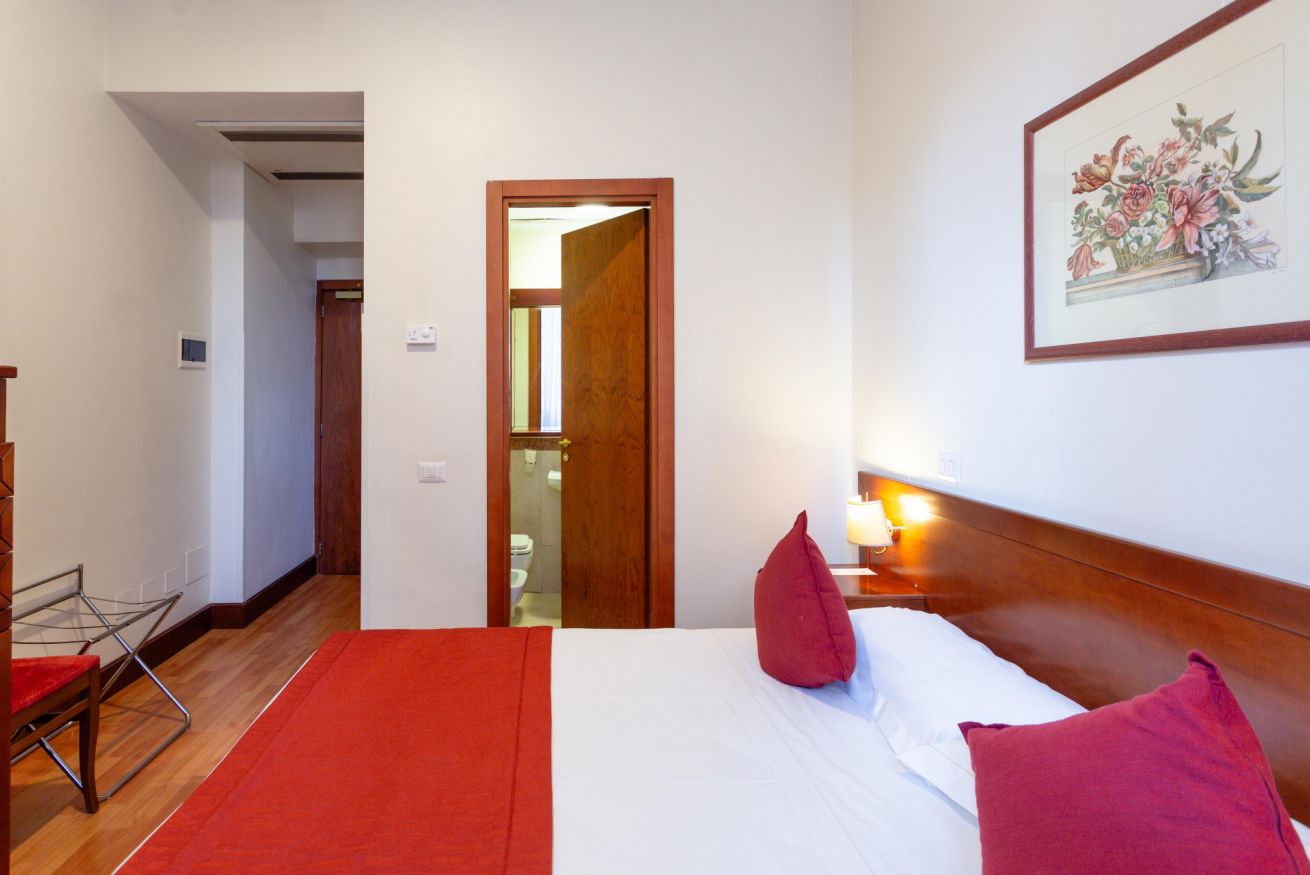 Camera per due persone con letto matrimoniale e bagno privato. Dotata di minibar, cassaforte e aria condizionata/riscaldamento.